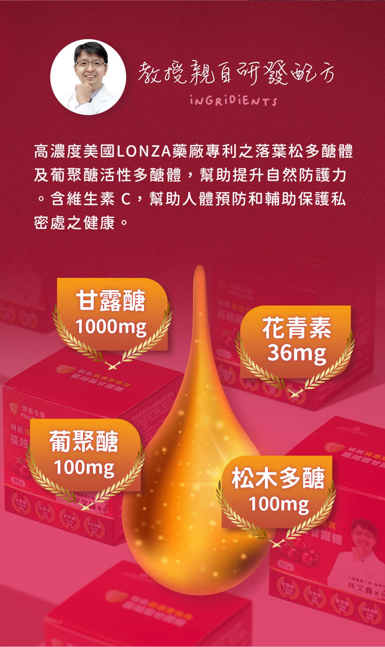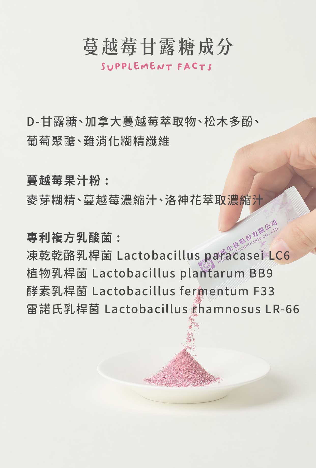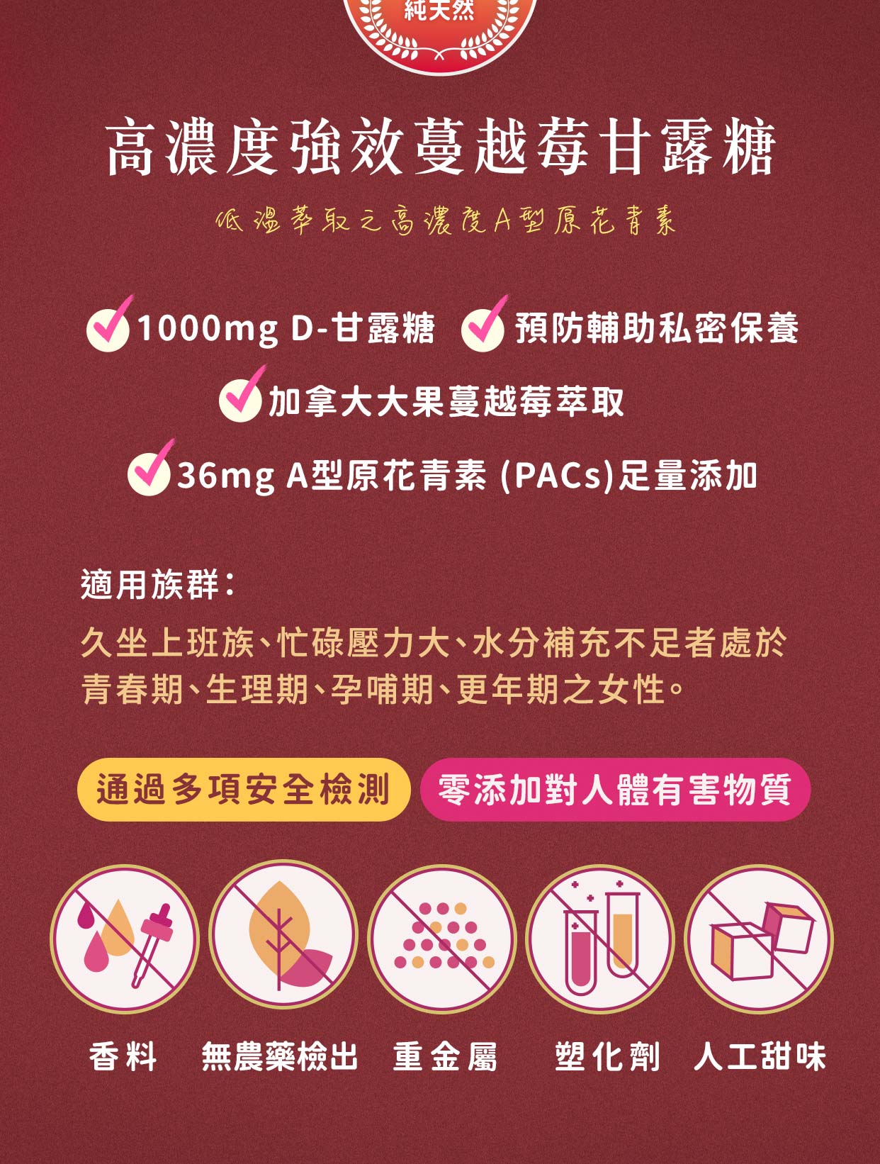2.本品每份含有1000mg之D-甘露糖,可預防和輔助保護私密處。
