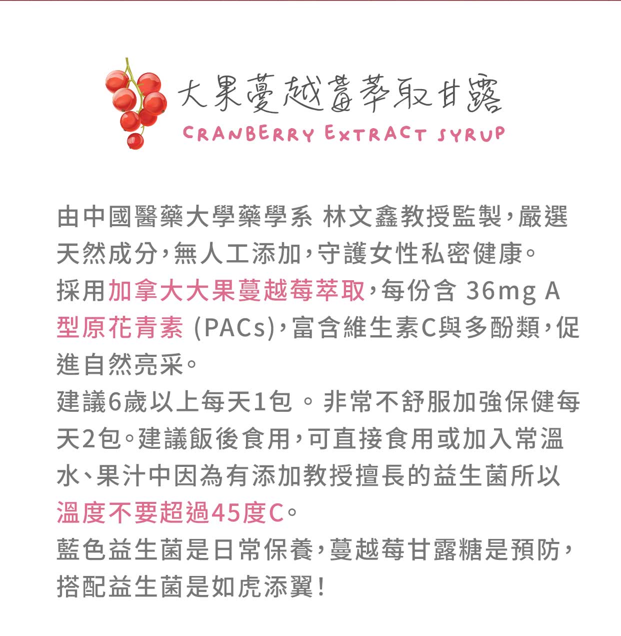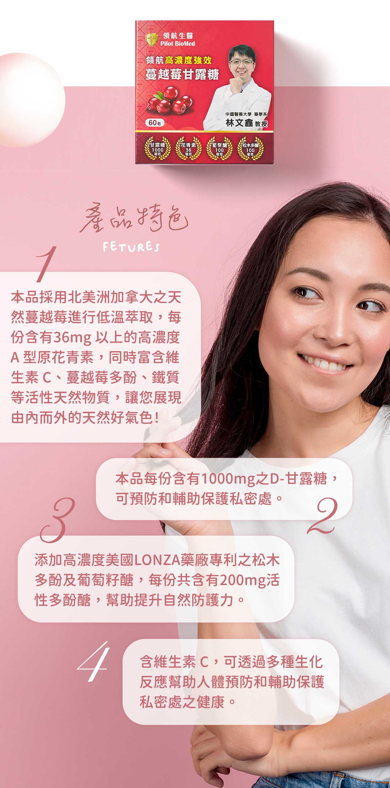 1.本品採用北美洲加拿大之天然蔓越莓進行低溫萃取,每份含有36mg以上之高濃度A型原花青素,同時富含維生素C、蔓越莓多酚類、鐵質等活性天然物質,讓您展現由內而外的天然好氣色!